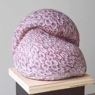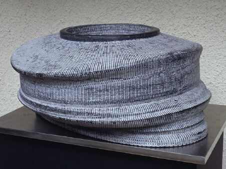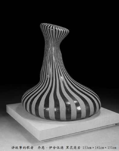 乔恩·伊舍伍德出生于1960年,是四位参展艺术家中最年轻的一位。当他还是一名英国高中生的时候,他曾经向往成为一名像亨利·摩尔那样的艺术家。但命运却让他成为卡罗的助手,为这位英国的金属抽象表现主义的大师工作长达15年。在这15年中,他走遍世界各地并最终定居美国。在艺术方式上乔恩并没有追随卡罗的金属抽象,而是选择了水泥和石头进行自己的创作。这也许与他最初对亨利·摩尔的喜爱有关。20世纪80年代初乔恩在美国举办首展获得了出乎意料的成功,他从此开始了自己职业雕塑家的生活。乔恩看起来是一个质朴的人,那种用手工直接塑造泥土的感觉和表现力始终吸引着他。乔恩的方法是首先用泥土进行塑造,泥坯那种旋转和围裹的形态令人联想到陶艺。这使他的作品不同于布鲁斯和肯尼斯那种纯正的现代抽象构成,而保持着与古老手工传统的亲密联系。然后乔恩把这个成型的泥塑用三维扫描仪扫描到电脑中,转换成为一个虚拟空间中的数码模型。再在电脑中把某种平面的或浅浮雕的连续图案,例如水波肌理或线刻肌理,用3DMAX粘贴到这个模型的表面。平面的图案会自动随着模型的表面呈现出疏密变化。至此乔恩的作品成为手工随机形态与数码精确规则的结合体。它们是关于生命感性与科技理性、手工传统与数码信息的统一表述。