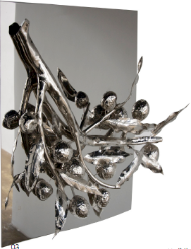 以中国花鸟画的图式为母题,以不锈钢的高浮雕描绘传统中国画中的图像,陈志光在空间维度上再现了传统的中国美学。文人画是表达传统中国美学的重要载体,而卷轴和册页是传统文人画的最重要的形式,陈志光运用这种形式,向观众传达希望把当代艺术与传统美学联结起来的意图。以雕塑的立体空间方式,在形式上对于传统水墨画进行模仿,这种行为本身带有更多的观念色彩。虽然美国波普艺术家利希滕斯坦也会把自己的平面作品转化为雕塑,会把一个类似水墨的笔划放到立体的空间当中,然而那只是一种简单的由平面向空间的转化。陈志光的卷轴和册页作品似乎带有波普的观念,但它们与波普更早的源头马塞尔·杜尚有更紧密的关系。杜尚把“现成品”的观念引入艺术领域,成功地把“反艺术”变成了艺术。“现成品”的观念几乎影响到了整个上世纪的艺术,它成为了当代艺术的