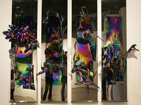 以“蝼蚁之道”来创造所谓“动物政治学”的陈志光曾被人称为具有“魔幻的诡异”,在最近一年来的作品完全摆脱了所谓的政治学和意识形态的特征而呈现出了新的面貌。2008年底,借赴厦门参加首届海峡两岸文化产业博览会之机,我参观了陈志光在漳州的工作室,在那个大而朴素的工作室里,我看到了他新创作的卷轴作品。那些镜面不锈钢所作的传统花鸟画卷轴,把人工雕凿之美与自然之美结合在一起,在自然的光线下焕发出绚烂的光芒。与他坚持多年的“蚂蚁”系列作品相比,那是一种完全不同的视觉感受,除了在材质上与以前的作品相关,其他的一切似乎从头开始,那种异样的感觉,使人一时无法理解他的意图所在。