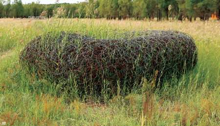 沙伟臣天天都在编网,那些在黄河堤岸用来固定石块的铁丝网,在他日复一日的反复编织劳作中,透出一股超然的禅意。线性的细节造就出和草原牧草相似的肌理,半透明的效果和柔软松弛的形态,更是将透彻清新的草原空气贯穿其中。这些来本自于土地的金属材料,倾听了创作者的轻声低语最终化做两颗露珠,淡淡地融入到内蒙古草原的蓬勃舒展的青草中。这里看不到人对自然的粗暴干涉,只有尊重与提升。这种公共艺术最应该具有的特性,沙伟臣在这里用最朴素的形式体现得淋漓尽致。