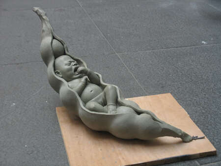 在现场展出的作品中,有的婴儿骑在一只锃亮钢盔上啼哭,令人立即想到了战争、杀戮,有的婴儿坐在一把古老的太师椅上哇哇大哭,让人想到古代私塾或某些等级森严场合下的规矩和禁忌,有的婴儿被安置在一只两米多高的木栅栏中,身边放着奶瓶,婴儿向外张望,眼神中是对外界的渴望和无可奈何,还有的婴儿变身豌豆公主,形体圆润饱满,和其他豆子一同躺在豆荚中……